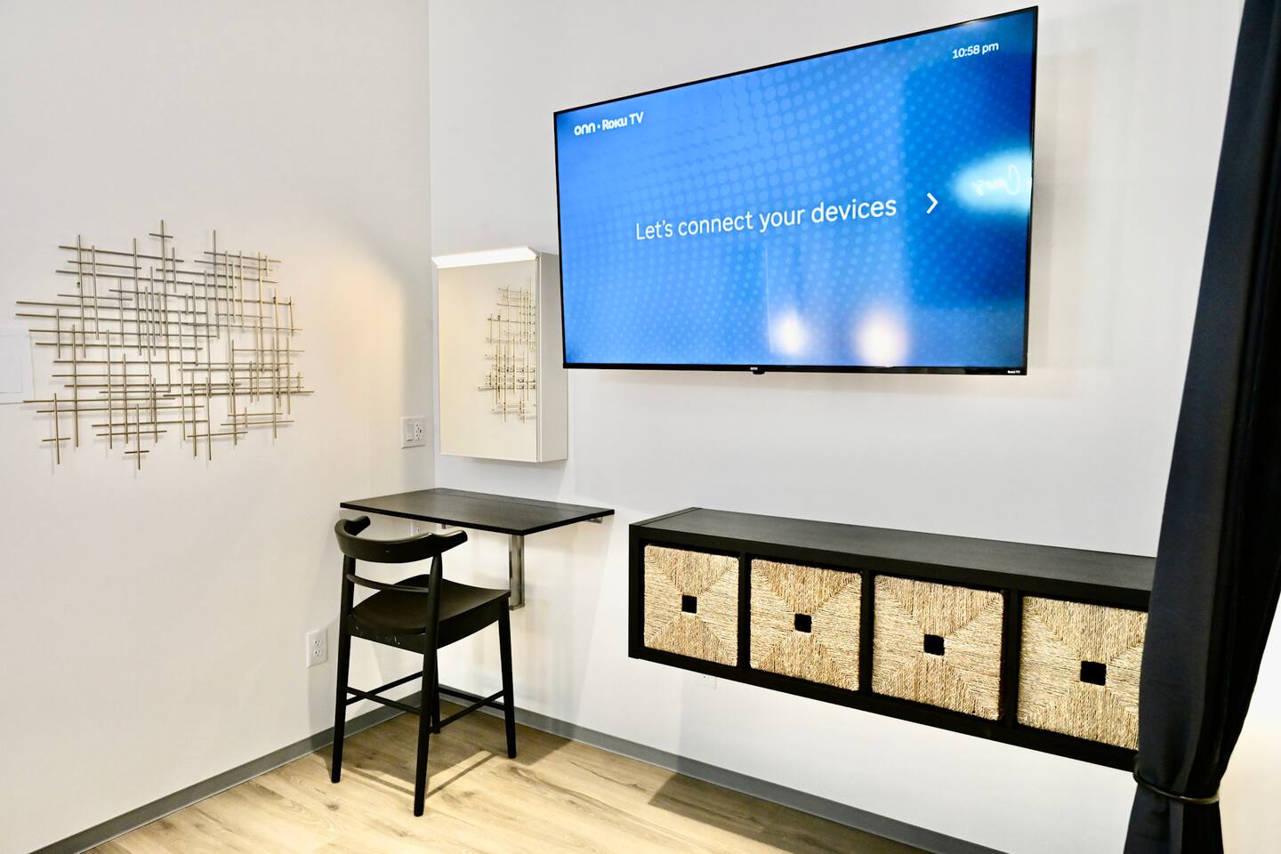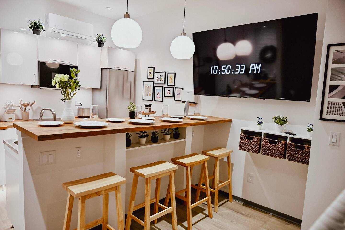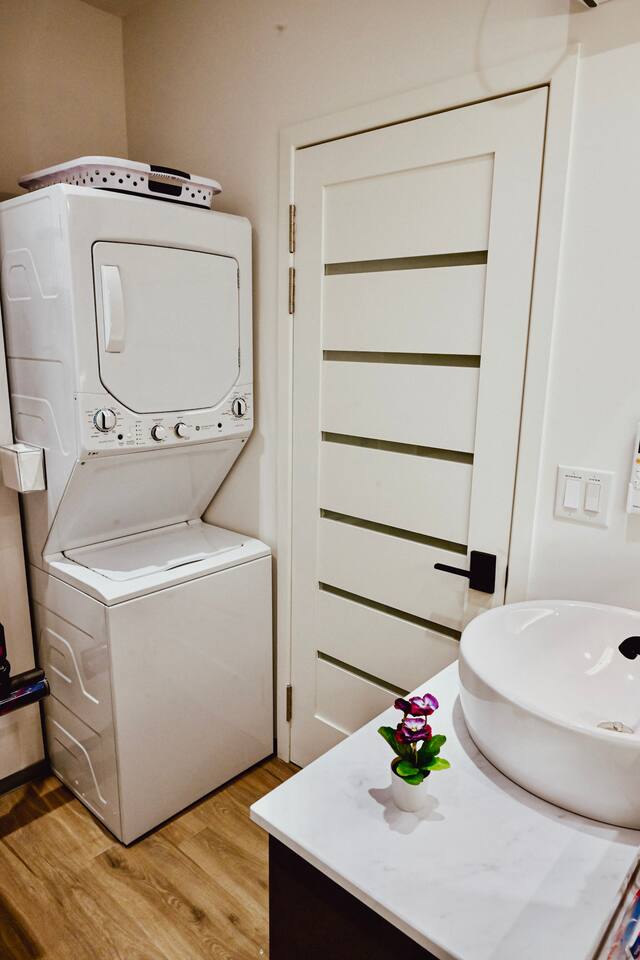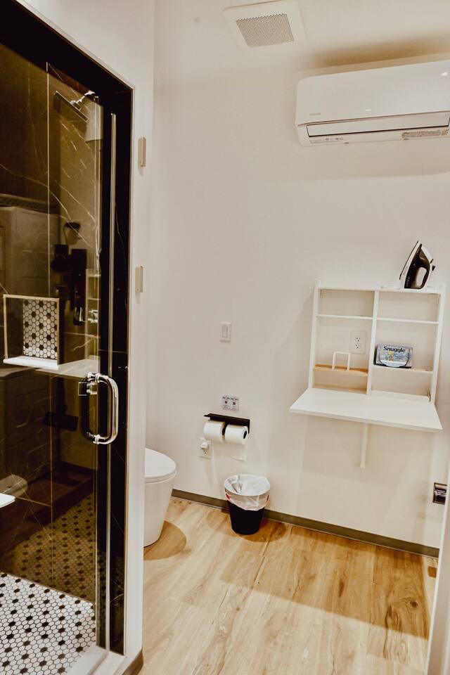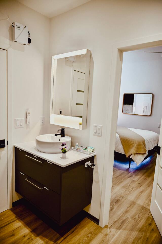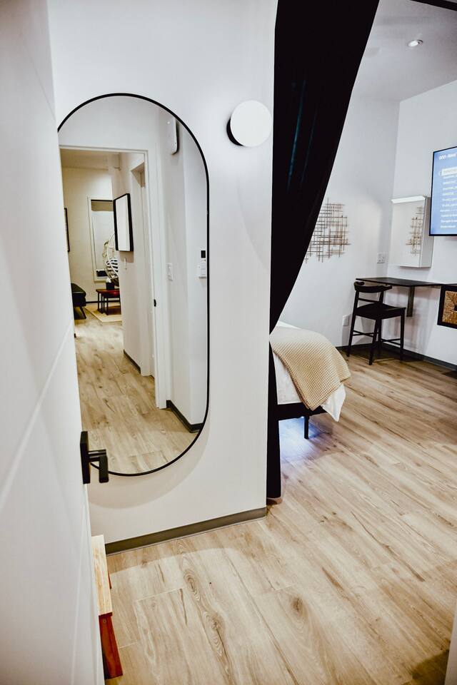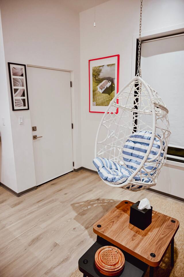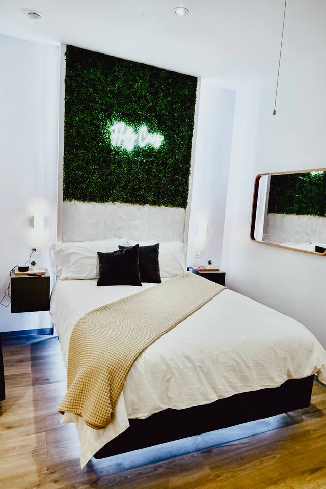 Step into a bright, contemporary studio designed for ultimate comfort and relaxation. The unique design, featuring a faux-grass accent wall and a cozy hanging wicker chair, creates a stylish and inviting atmosphere for your retreat. This space is perfect for up to four guests. Key Features: Sleeping Arrangements: Sleeps four comfortably with one plush Queen Bed and one full-sized futon. Full Kitchen: Equipped with all necessary appliances for your culinary needs. Modern Bathroom: A clean, modern bathroom stocked with essentials for your convenience. In-Unit Amenities: Enjoy modern comforts including a washer and dryer, Wi-Fi, air conditioning, and a TV for your entertainment.